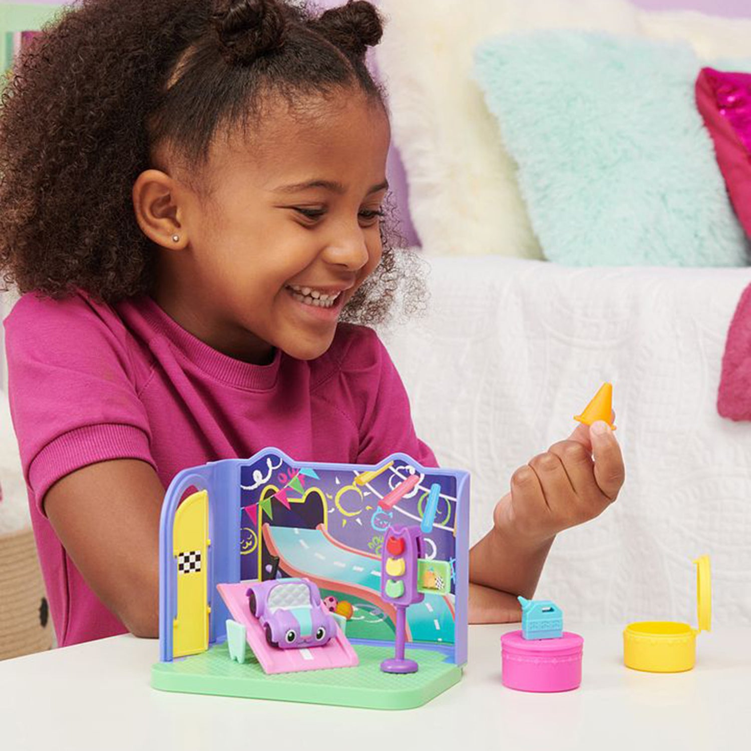 Get ready for some Cat-tastic playtime adventures in the Carlita Purr-ific Play Room! This deluxe Gabbys Dollhouse playset is filled with fun and exciting details to explore, bringing this magical room from the show to life! Featuring a mini Carlita toy car, with real working wheels, a bedroom door with a checkered flag design, along with a street-themed see-saw ramp and miniature stop-light that features a Hamster Kitty crossing-guard graphic that pops out when you press on the green kitty shape! Gabbys Dollhouse toys, plush toys, toy figures and playsets are educational toys that make great gifts for kids, ages 3 and up, as they help to expand his or her imaginations through exciting and creative pretend play!Includes 1 Room, 1 Toy Car, 2 Furniture Pieces, 2 Dollhouse Deliveries, 2 Accessories, 1 Instruction Sheet
