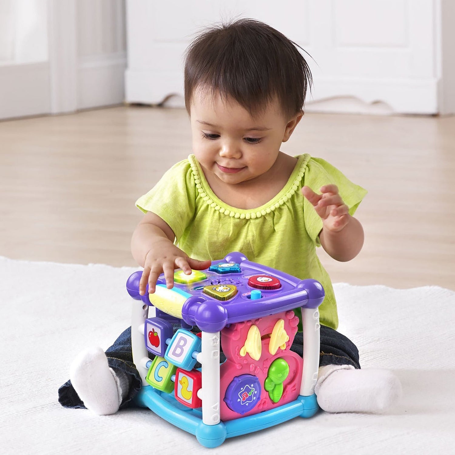 Explore and learn on every side! Learn and play every day with the Turn & Learn Cube by VTech! Featuring 5 sides to explore, this activity cube attracts your baby's attention with music, chunky light-up buttons, bright colours and more. Light-up buttons introduce animals, animals sounds and shapes. Press or slide the musical instruments to hear their name and sounds, also includes 5 sing-along songs and 20 fun melodies. The cube also features lots of sliding and spinning manipulative features to encourage interaction and a motion sensor that triggers fun sound effects. Encourages motor skill development, imaginative play and language development.