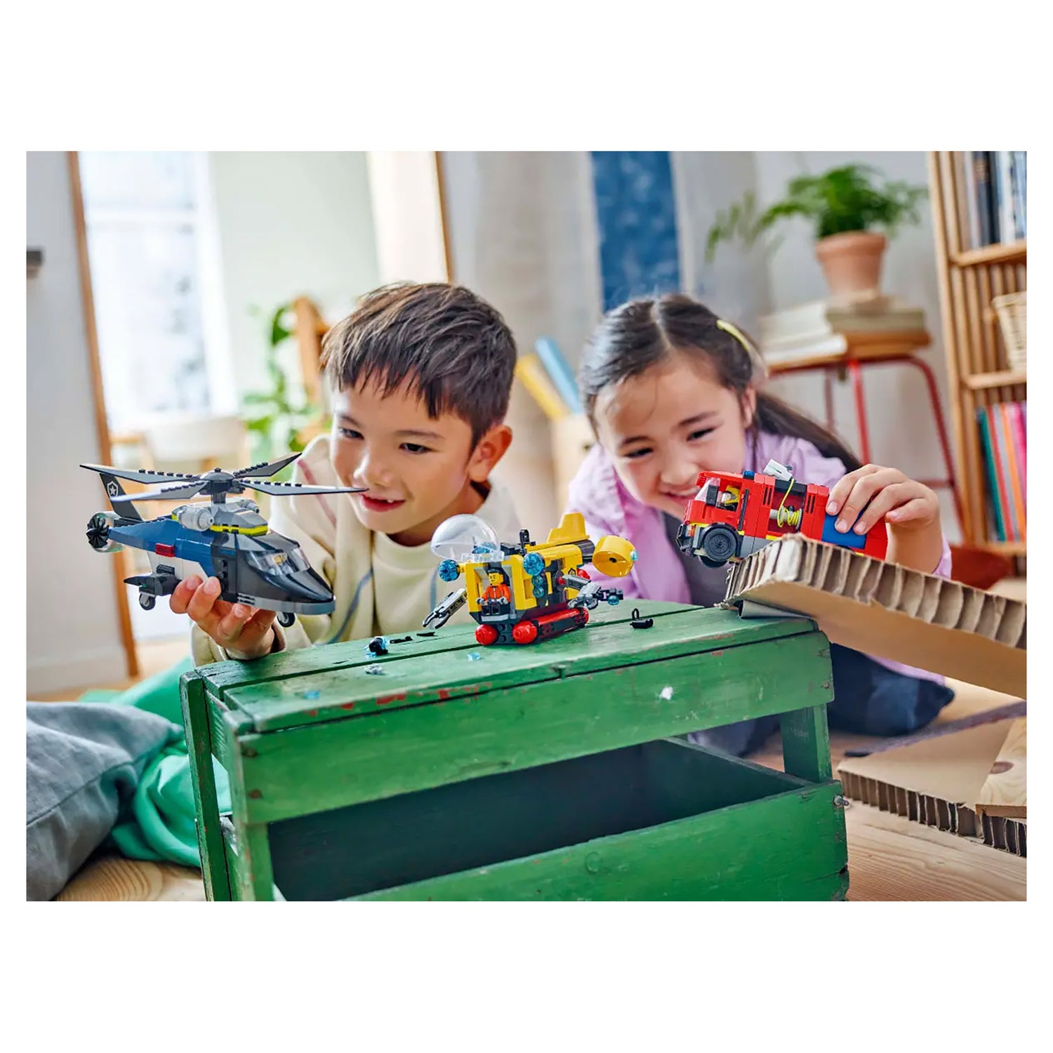 This helicopter, fire truck and submarine toy playset includes a printed building guide and 3D instructions in the LEGO Builder app – a digital building companion with intuitive zoom and rotate tools that enable kids to visualize models from all angles as they build.