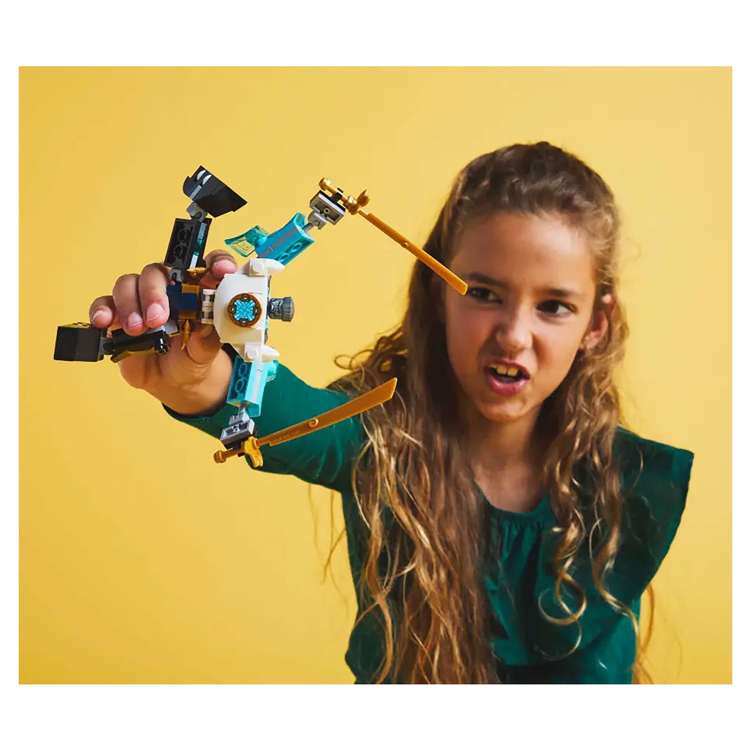 The LEGO® NINJAGO® Zane’s Battle Suit Mech (71827) pretend play toy set lets boys and girls aged 6 and up stage exciting action from season 3 of the NINJAGO Dragons Rising TV show. This building set for kids features a NINJAGO mech with posable arms, legs and hands, an upper body that rotates through 360 degrees, an opening chest to place a minifigure inside and 2 big sword accessories.