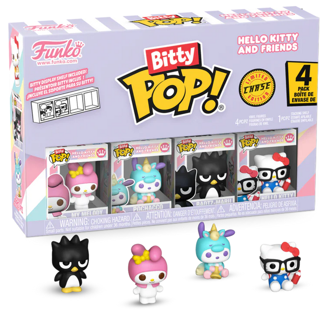 Expand your Sanrio Hello Kitty and Friends collection with this 4-pack featuring Bitty POP! My Melody, Bitty POP! Pochacco – Unicorn, Bitty POP! Badtz-Maru, and a chase Bitty POP! collectible.