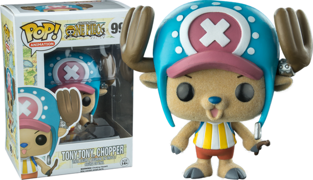 This Pop Vinyl features Tony Tony Chopper, he is a doctor and a blue-nosed reindeer. The Human-Human Fruit provided him with the ability to transform into a human or human-reindeer hybrid. This Tony Tony variant features the reindeer with a fuzzy flocked finish!