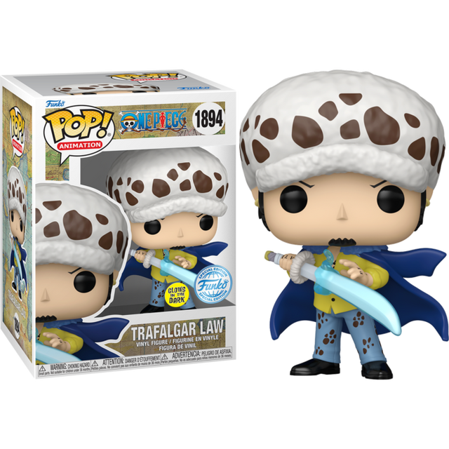 This exclusive, glow-in-the-dark Pop! Trafalgar Law is armed with his sword, Kikoku, and ready for battle with the powers of the Ope Ope no Mi Fruit using his Anesthesia technique.