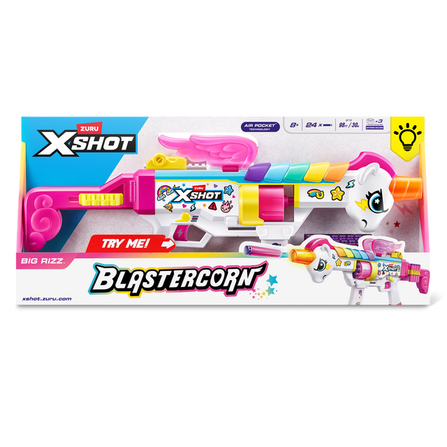 Introducing the bold and brave XSHOT Big Rizz Blaster, where fierce blaster meets whimsical unicorn to create your lastest formidable winged warrior. The Big Rizz lights up the battlefield with its illuminating horn and flapping wings bringing an explosion of color and excitement to your battles. Equipped with 24 Air Pocket Technology foam darts, it delivers powerful blasts reaching up to 98 ft/30m, offering everything you'd expect and more from a Blastercorn & bigger and better than ever! Perfect for outdoor play or open spaces where you willll be able to see your darts fly through the air up to 98 feet. It's the perfect blaster for ages 8+