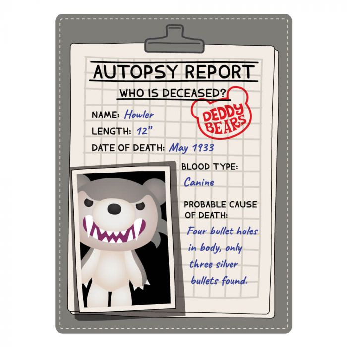 Deddy Bears are impulsive, fun, and super scary! The Deddy Bears Series 1 characters include Zombear, Bundle, Beezlebear, Spekter, Vambear, Bones and Howler. The 29cm Beezlebear plush comes complete with an autopsy report revealing his cause of death - being burned in hellfire while trying to sell his soul. Features soft and squishy materials and embroidered details. Presented in a black Deddy bag with zip. Deddy Bears are perfect for tweens, collectors, and fright fans alike.