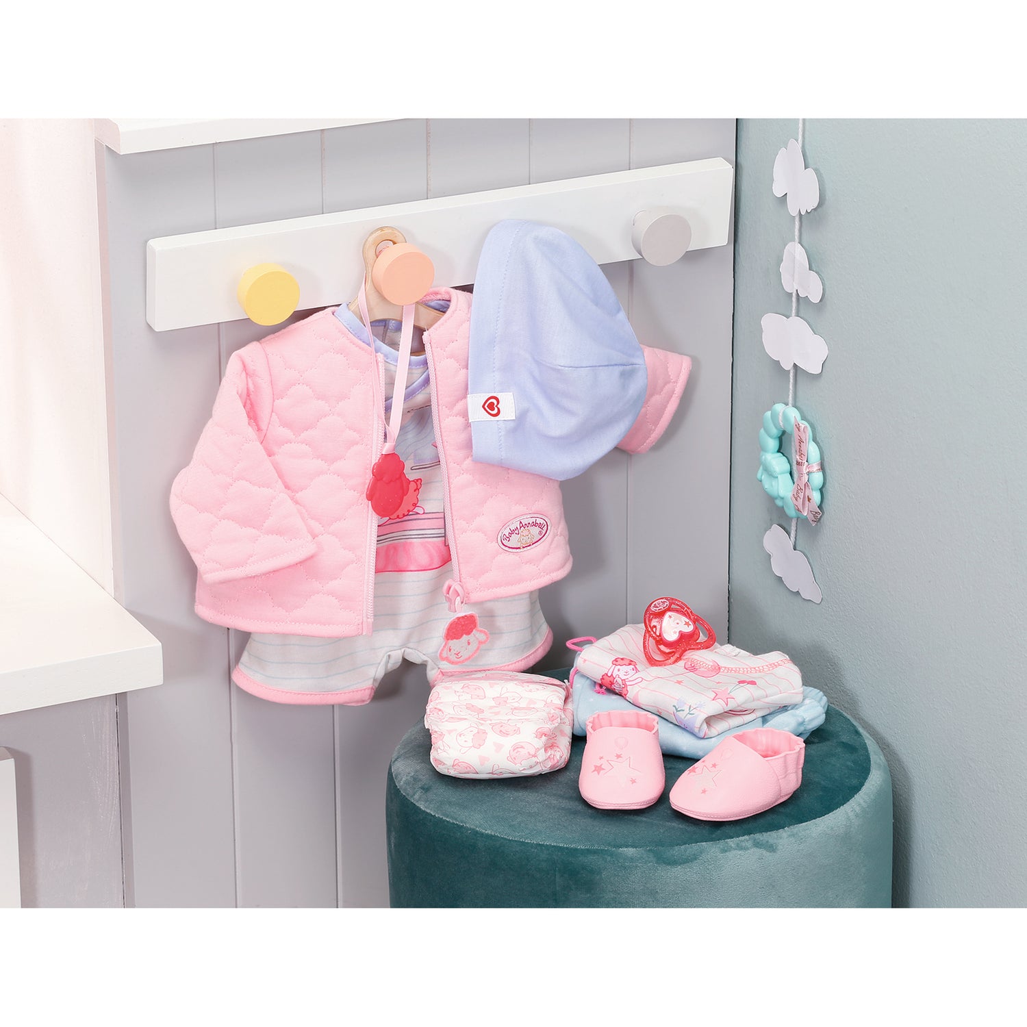 A pink jacket that could be made from fluffy clouds. Mint-coloured trousers with a stardust print. A striped top with an adorable sheep in the night sky. A stripy bodysuit in an asymmetric design. A hat as fine as purple clouds. A pair of pink shoes with silver stars. And so many possible combinations. The necklace with lamb pendant goes with any choice. The set also includes a teething ring, a dummy and a nappy. The 10 pieces are stored in the space-saving cloud box, which is also easy to transport.