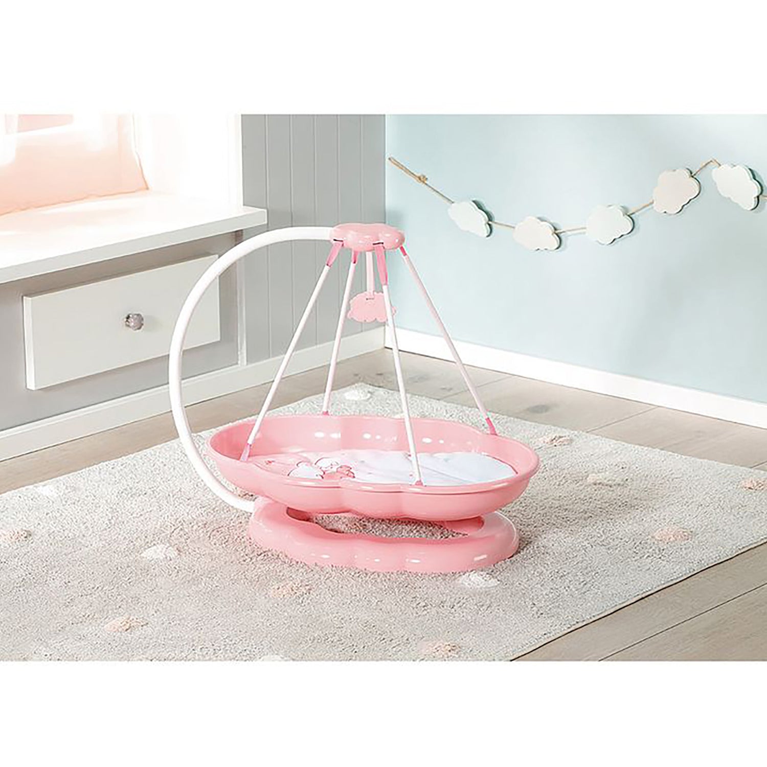 In this lovingly designed swing, Baby Annabell sleeps like she's bedded on clouds. It is perfect for a lunchtime nap or any nap for that matter. The special mounting and construction means the bed swings on its own, without any electronics. The cloud only needs to be pushed lightly to send Baby Annabell off to dream land. The little dreamer sleeps even more relaxed on the soft mattress. The swinging cloud mobile helps her fall asleep. Watching it swing is almost like counting sheep.