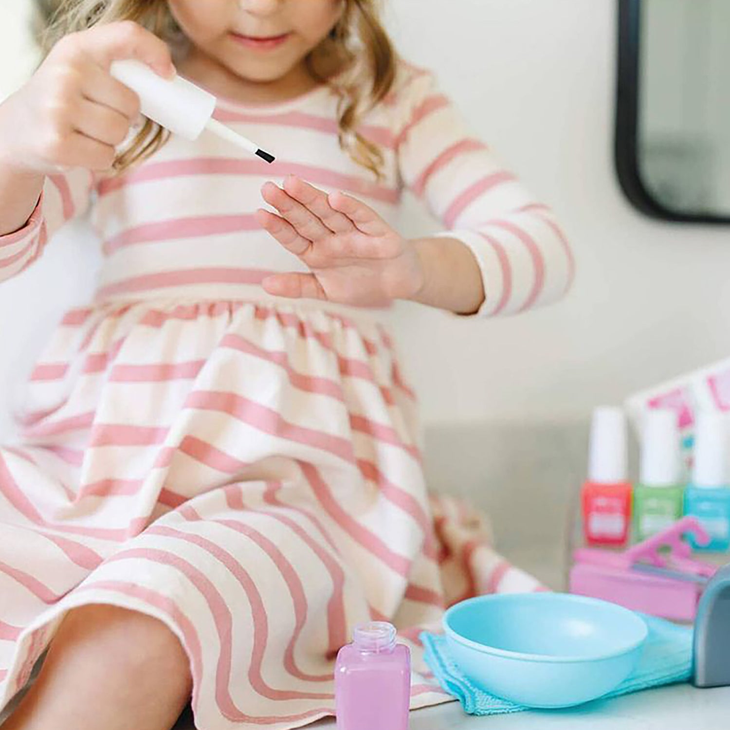 - Mess-free! DOES NOT CONTAIN REAL NAIL POLISH OR OTHER COSMETICS. 20-piece pretend play toy nail care play set to give pretend manicures and pedicures