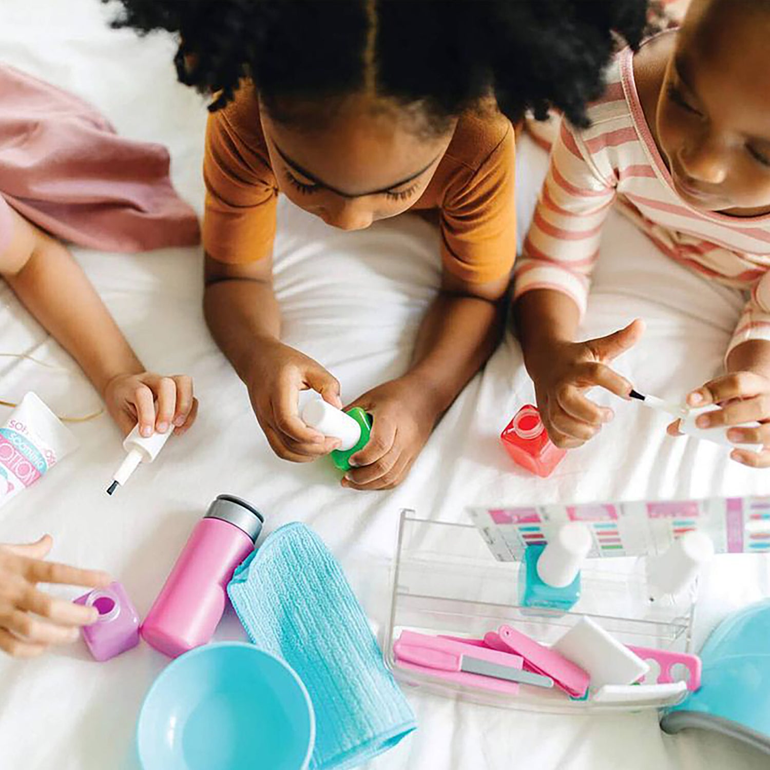 Perfect for mess-free imaginative play, THIS SET DOES NOT CONTAIN REAL NAIL POLISH OR OTHER COSMETICS. The 20-piece play set gives kids everything they need to give and receive pretend manicures and pedicures, with all of the fun and none of the mess! Start by "soaking" hands and feet in the durable bowl, use the empty tube with flip-top lid and the cloth to wipe dry and pretend to moisturize. There are realistic accessories to pretend to file, trim, clean up, and buff nails, and five play nail polish bottles with built-in brushes to "paint" nails! (Mess-free! Coloured polish bottles do NOT contain nail polish.) Round out the nail salon experience with fun details like an empty "polish remover" pump bottle, toe spreader, and pretend nail dryer with LED light (2 AA bRole-playinguired, not included). Store and display items, including the reusable activity card, in the clear tabletop caddy with colour chart! Role playing real-life experiences with Love Your Look play sets is a great way for kids three and older to build confidence, empathy, and self-esteem