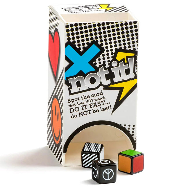 Not It! ™ is fast and frenzied fun for everyone! When the 3 dice tumble from the dice tower, you must find a card in your hand that does not match any of the 3 attributes on each dice!