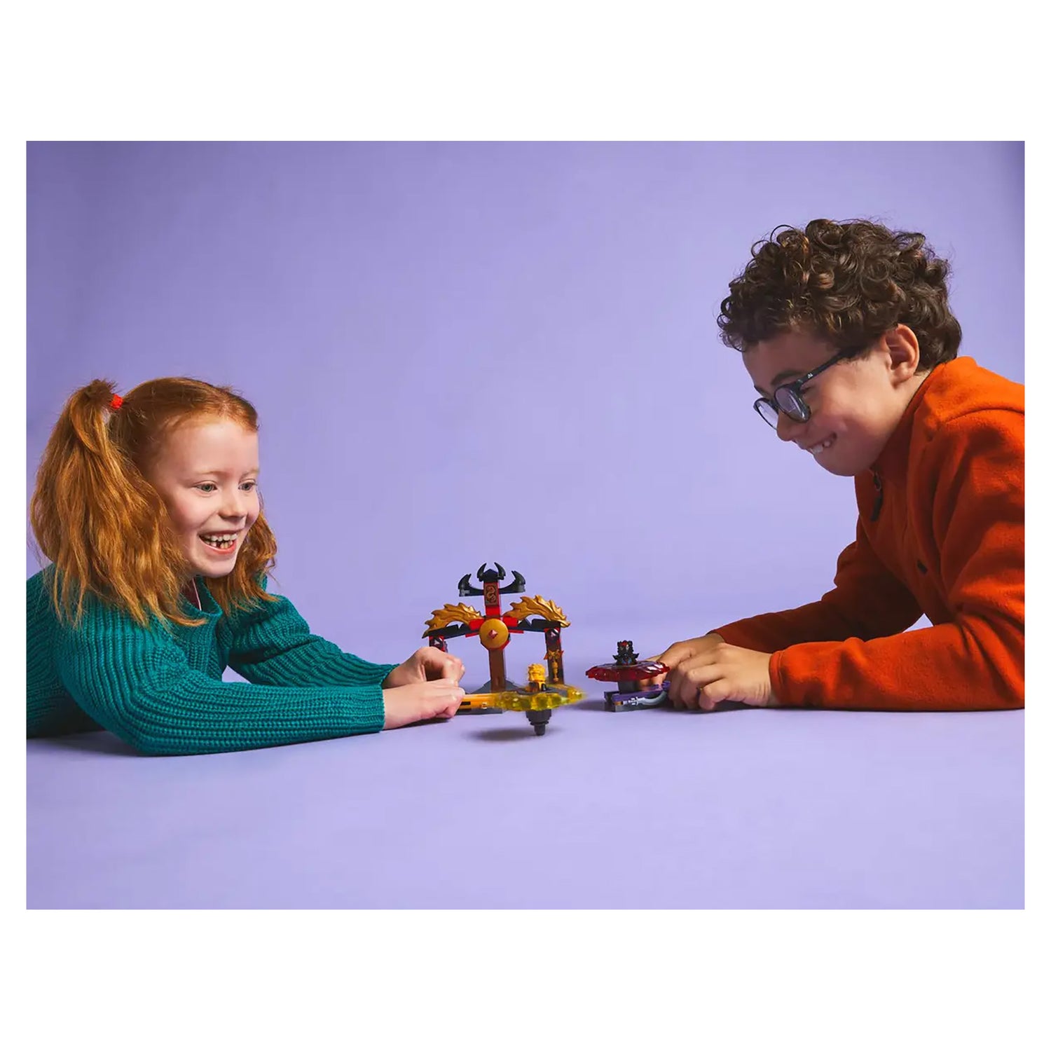 The Dragon Spinjitzu Battle Pack (71826) action toy playset lets boys and girls aged 6 and up play out amazing action from season 3 of the NINJAGO® Dragons Rising TV show. This small LEGO® action toy set features a battle arena temple, 2 minifigures of Arin and Ras and 2 dragon spinjitzu spinner toys for kids to place into launchers and fire into spinning battles against each other.