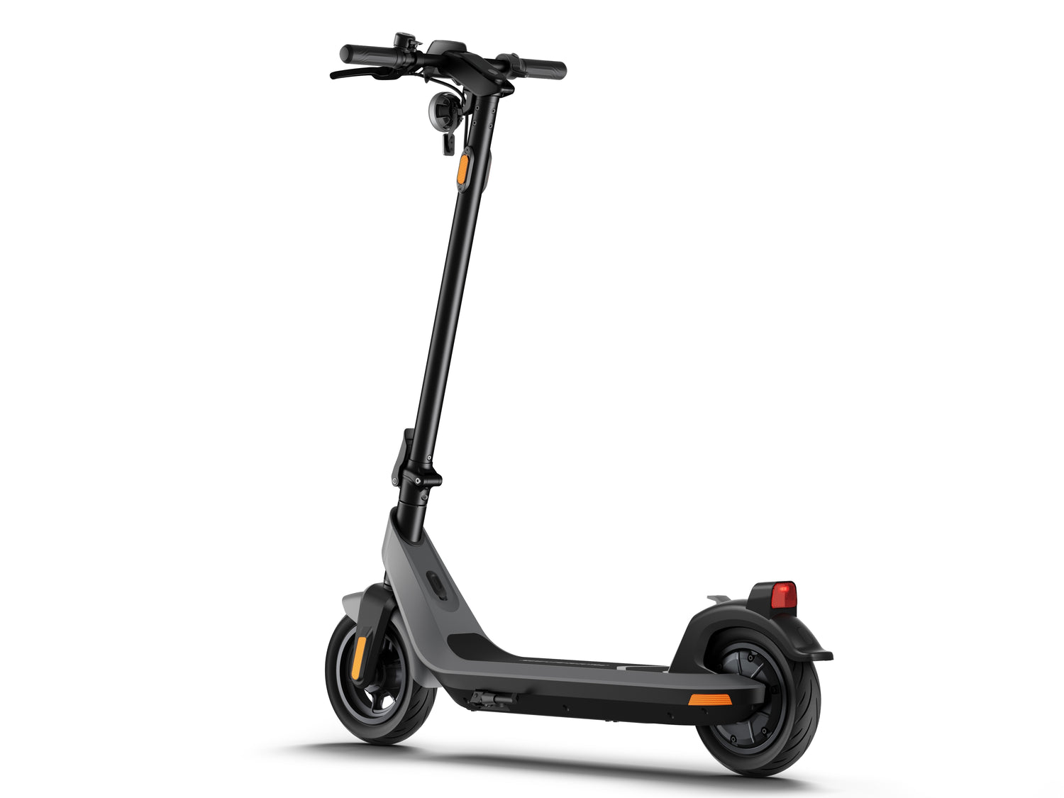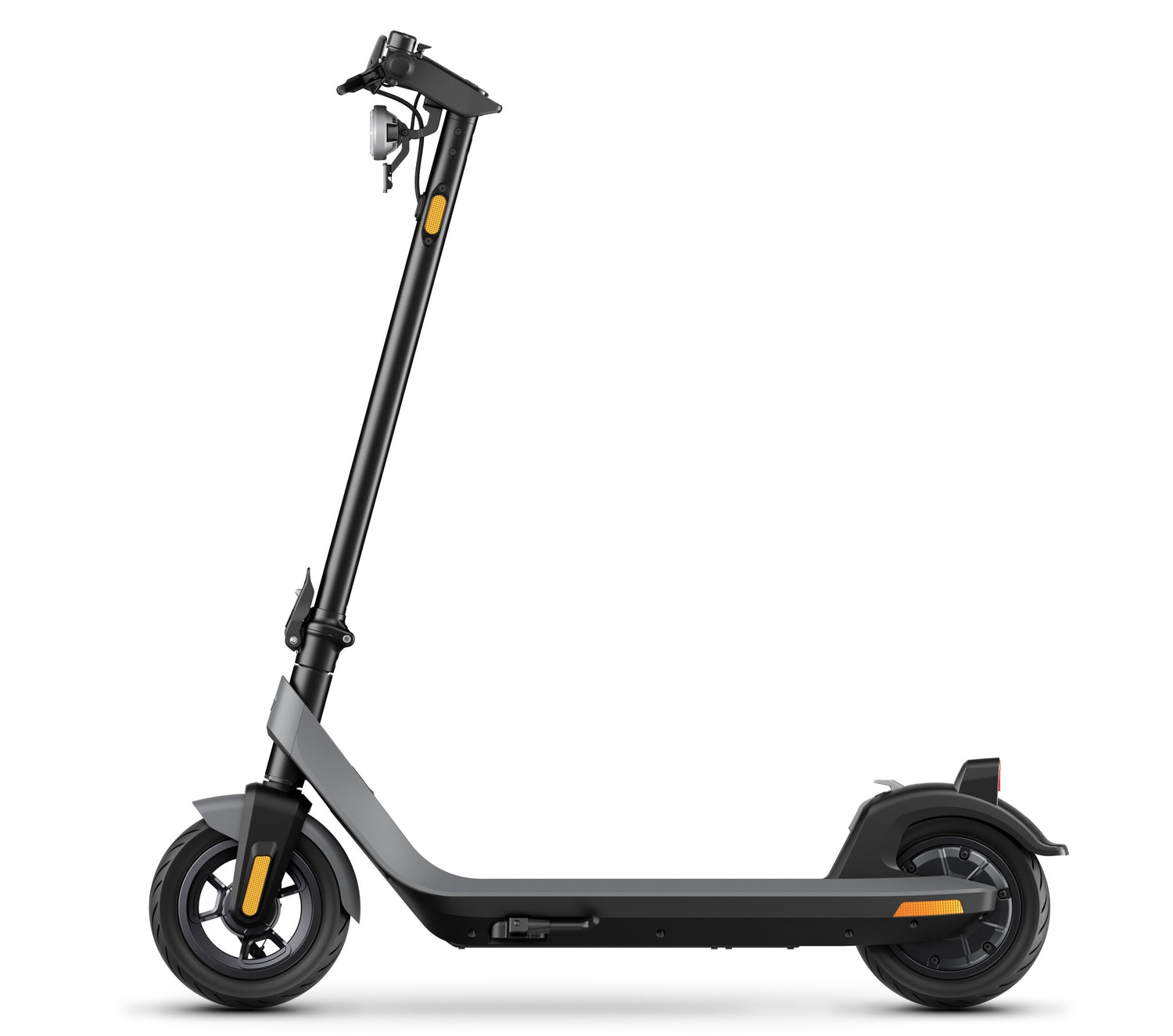 The larger 10” diameter and 2.3” wide tubeless tyres allow for a more stable ride and make going over speed humps and gravel terrain less of a bone-shaker ride.