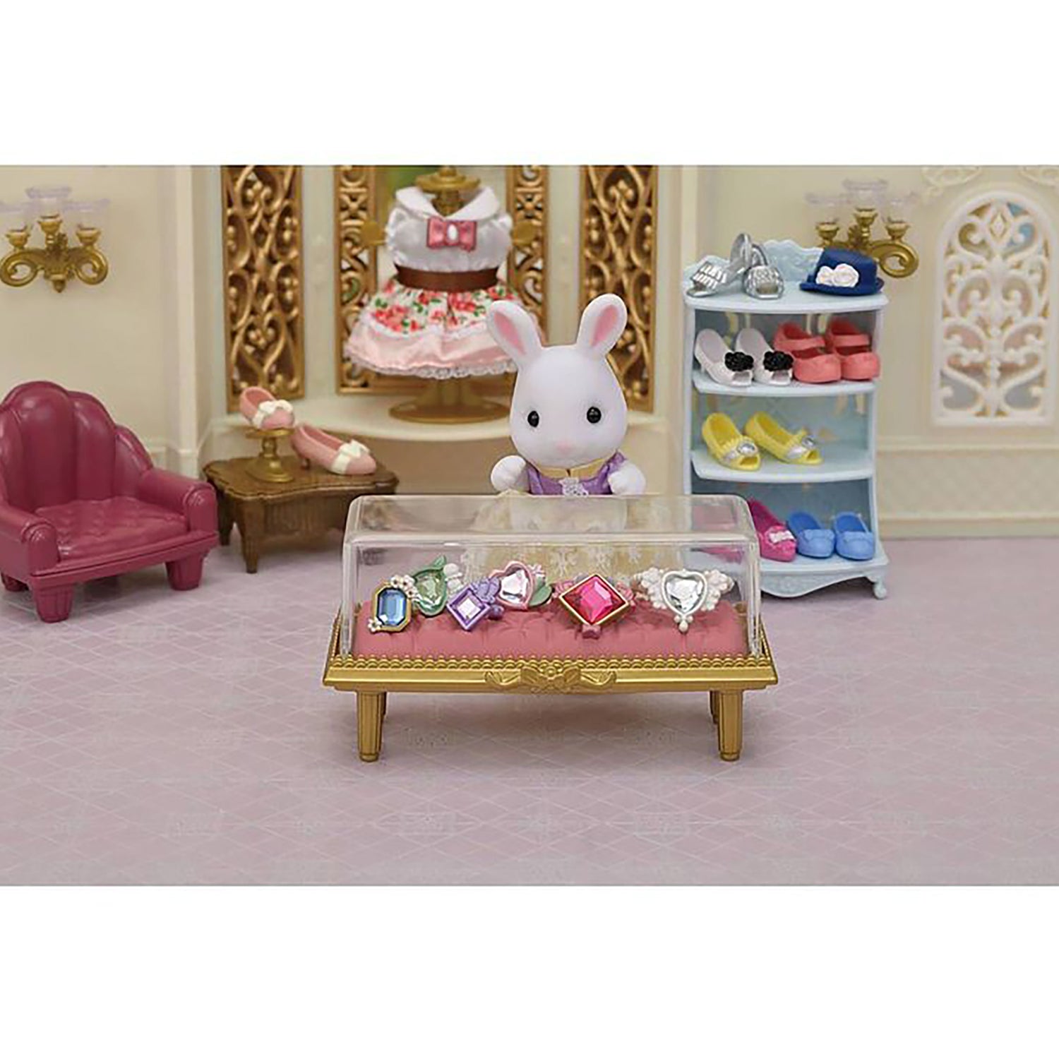 The Fashion Play Set Jewels & Gems Collection contains Snow Rabbit older sister Ruby and flower-themed accessories with sparkly rhinestones. This set can be used to mix and match different clothes and accessories. Contains a jewellery case with clear lid to show off the accessories inside. The daisy and butterfly earrings can also be worn as bracelets.Ruby, the Snow Rabbit older sister, is the editor of the town's fashion magazine. She loves sparkly jewels, and her collection is so important to her that she even gives her jewels names.Combine with other Fashion Play Sets (sold separately) for even more fun imaginative playtime!