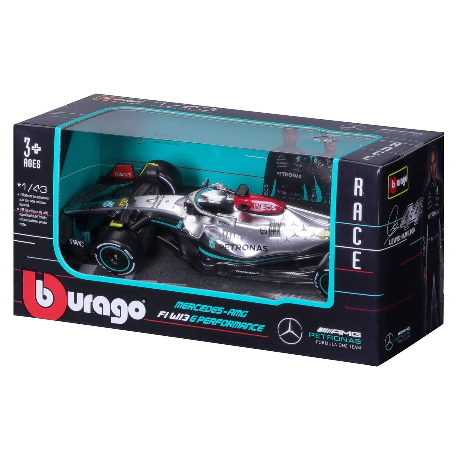 1:43 2022 F-1 Mercedes AMG W13 Hamilton. Driven by British F1 Driver Lewis Hamilton in the 2022 Race Season, the Bburago Diecast model showcases the Mercedes W13 with Hamilton's number 44 on the side of the car. This 1:43 scale size model is highly detailed, featuring an electrostatic paint coating and realistic printed decals that faithfully replicate the aerodynamic design of the F1 car. With dimensions of 5.55 x 2.76 x 2.63 inches, this model offers a precise and compact representation of Hamilton's racing machine.