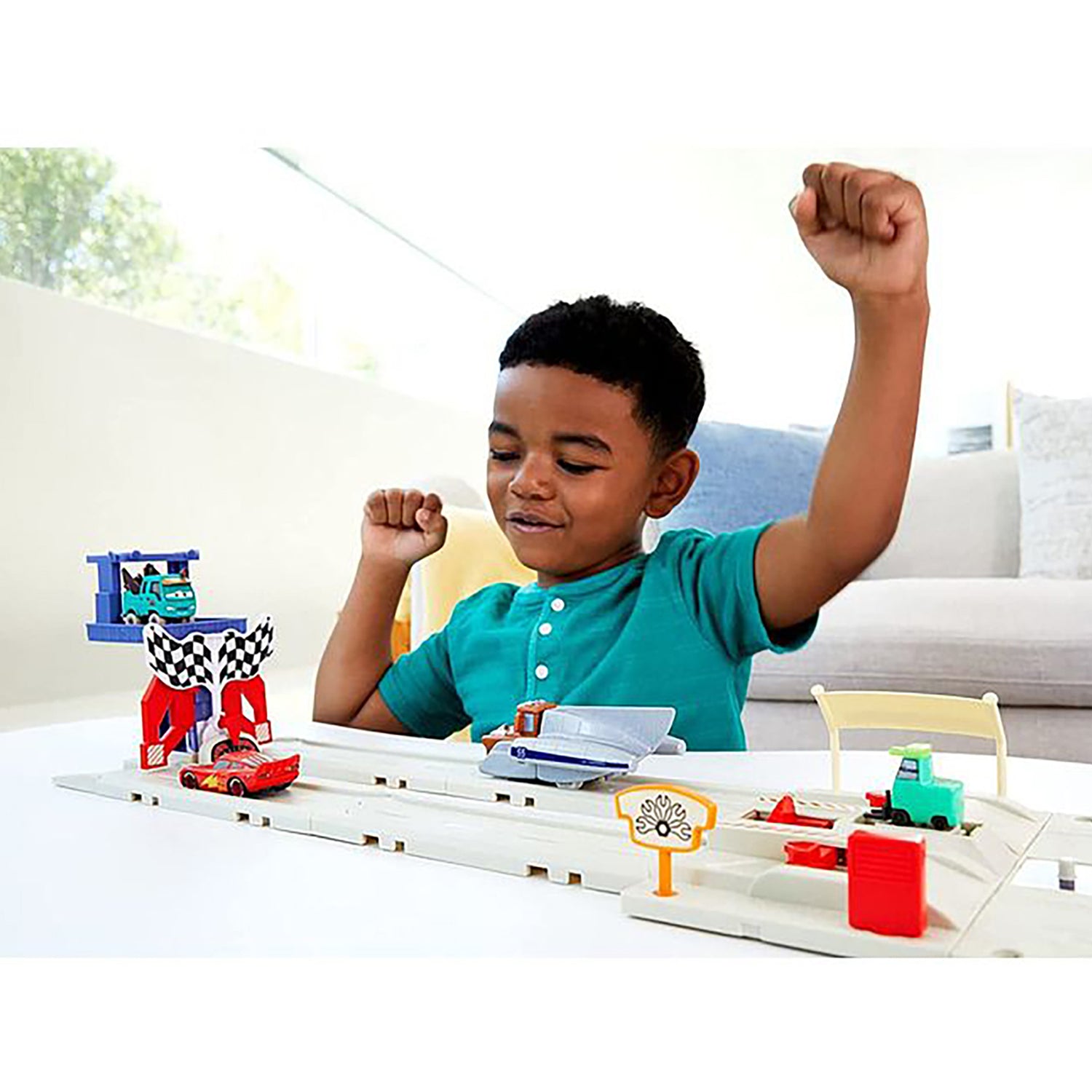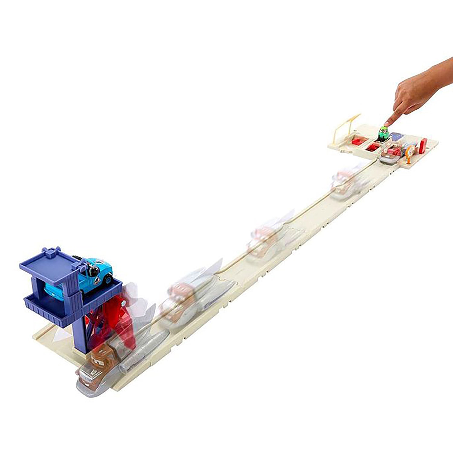 Inspired by the Disney+ series from Pixar, Cars On The Road, this Salt Flats Super Speed Playset shows off a fan-favouriteite character in a big way -the included Super Speed Mater vehicle is oversized and complete with rocket-like details! Kids can let the series exclusive Pitty vehicle, Sara Coggs, tune up vehicles before the race, then watch Super Speed Mater truck and his friends (other vehicles sold separately) race down the track to hit the target and turn the flag. Cars fans can connect the tracks in multiple ways to create moments from the series at the iconic location -and they can collect all the show and movie vehicles to play out adventures (each vehicle sold separately, subject to availability). Colours and decorations may vary.