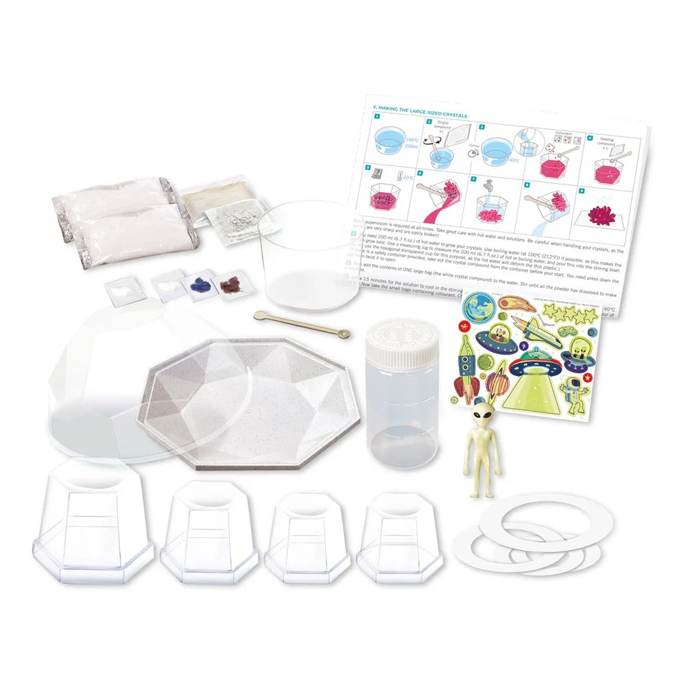 Grow 4 outer space crystals and decorate your terrarium with a glow-in-the-dark alien figure and glow stickers. It will be out of this world! It is a wonderful creative product for kids who love science and space. Contents: 1 Alien figurine, 1 sheet of glow stickers, 1 bag of gravel, 1 bag of sand, 2 white crystal compounds, 3 colourants, 1 white seeding compound, 1 stirring bowl & spoon, transparent growing cups (1 large, 1 medium & 2 small) 1 terrarium tray with cover, ring-shaped templates & detailed instructions.