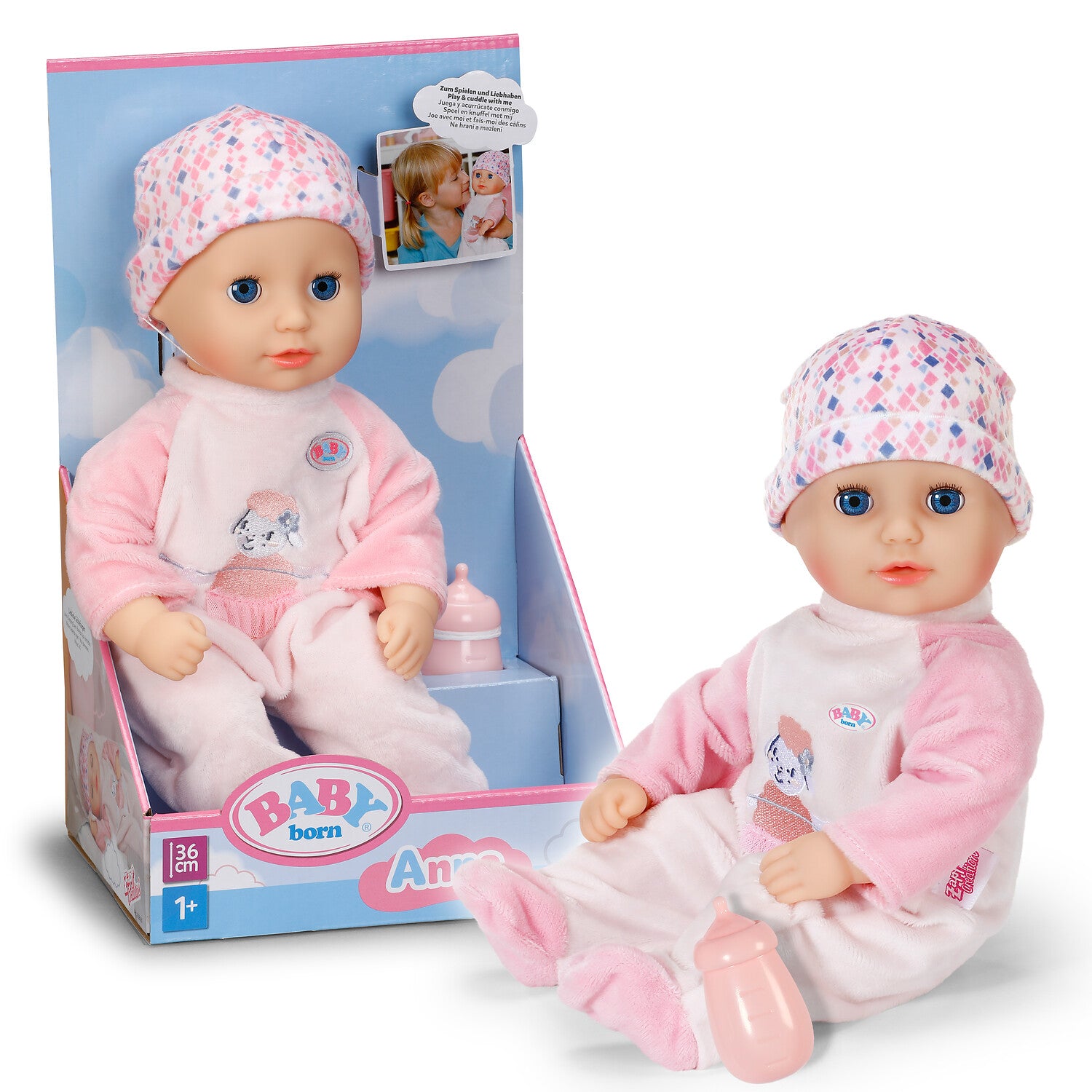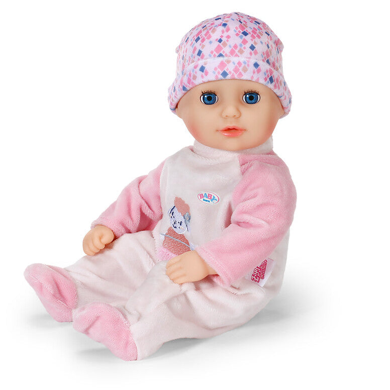BABY born Anna Rose invites you to cuddle with her soft fabric body and is the ideal first playmate for the little ones with her smaller size. If you lay them down for an afternoon nap after their bottle, their sleeping eyes close. In addition to her bottle, Anna also brings a pastel-colored, pink romper with a matching hat.