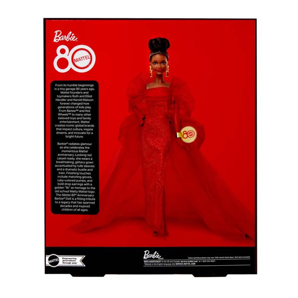 The Mattel 80th Anniversary Barbie doll honors the legacy of a company that has spanned decades and inspired children of all ages. From its humble beginnings in a tiny garage 80 years ago, Mattel forever changed how generations of kids play, creating iconic global brands that continue to impact culture, inspire dreams, and innovate for a bright future. This collector Barbie doll radiates glamour as she celebrates the momentous Mattel anniversary! Doll stand included. Doll cannot stand alone. Colors and decorations may vary.