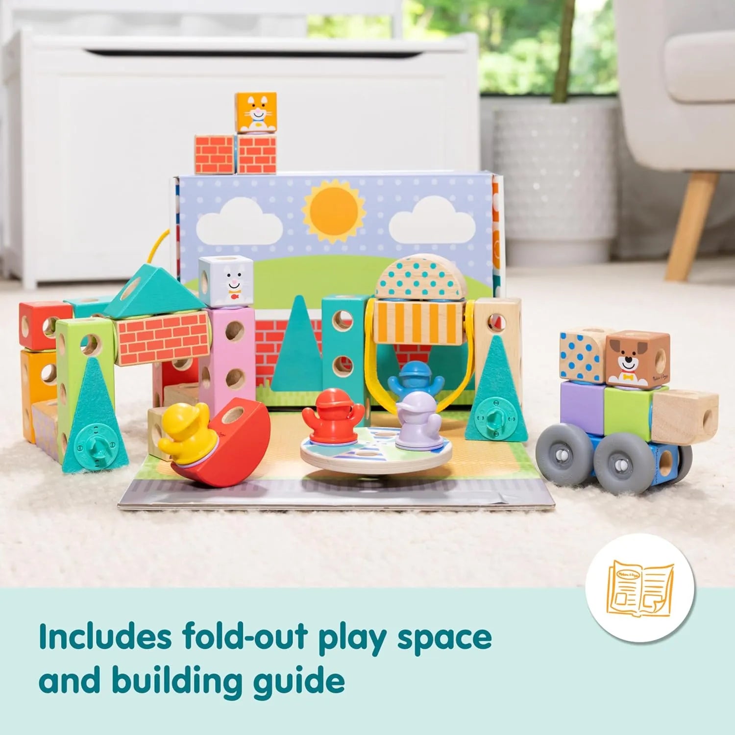 Easy-to-grasp smooth, colourful wooden blocks fit together in a snap with large connectors that even little hands can push in and pull out. An illustrated guide shows how to arrange and link the Blockables to create a multi-textured neighbourhood playground (swing, rocker, carousel, vehicle, pets, buildings, and more), or kids can use their imaginations to mix, match, and combine pieces to make unique creations and play their own way!