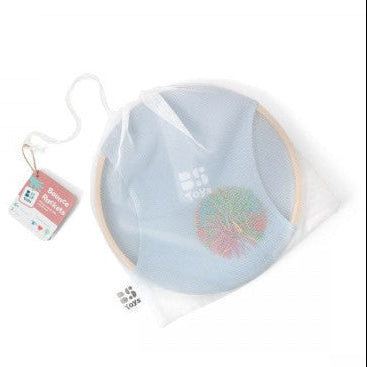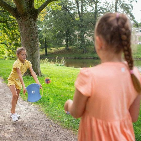 Introduce children to basic tennis skills with this easy-to-use game. Features bamboo framed rackets covered with stretchy bouncing fabric, plus a soft fluffy pompom ball. This tennis set is perfect for young children, as its rackets can be held with both hands. Contains 2 rackets, one ball and a drawstring netting storage ball. For 2 players aged from 6 years.