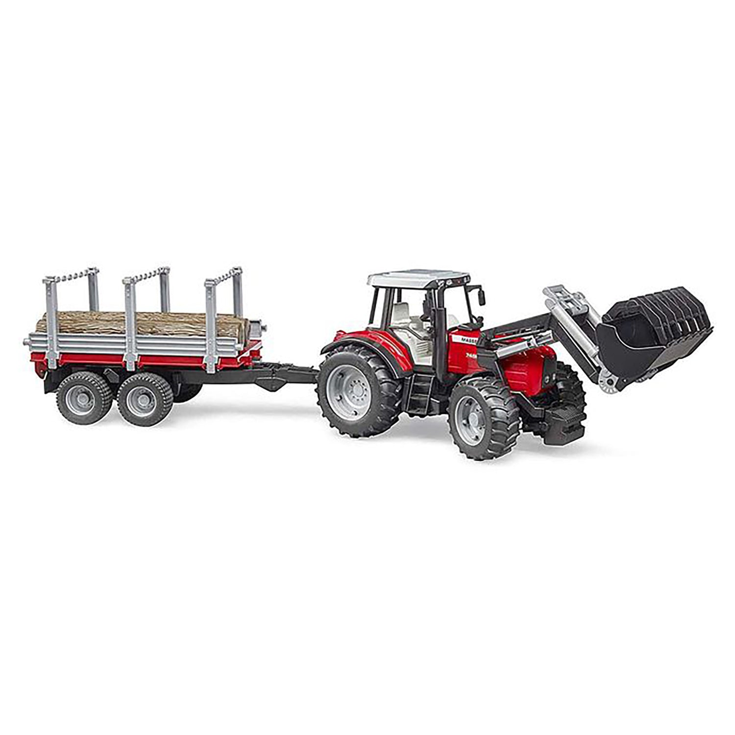 Whether as a building material or for energy generation, the raw material wood is on trend, and sustainable, efficient forestry is more topical than ever. With the new forestry set from BRUDER, this current theme can be recreated in an extremely realistic way. The 167 hp Massey Fergusson with slipon front loader is ideally equipped for working in the woods and the BRUDER model is in no way inferior.The offroad front axle can be steered either directly via the movable steering wheel in the cab or via the steering rod extension included, which children can attach to the movable steering wheel through the sliding roof in the cab. The fully functional slipon front loader can be attached or removed by removing the front weight. The engine bonnet can be opened to reveal the engine block.The BRUDER timber transport trailer is optimally prepared for the smooth transportation of timber. The side boards of the timber transport trailer can be folded down and the tracks removed. The foldout support leg provides secure positioning. Three tree trunks are included.