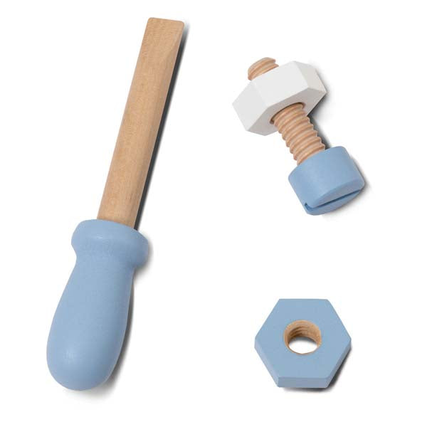 A tool belt which contains carpentry tools and accessories, such as a foldable level ruler, screwdriver, hammer, wrench, and screws etc. Children can tie it around their waist so they have all their tools to hand. They will learn how to screw and nail, and develop fine motor skills through creative play.