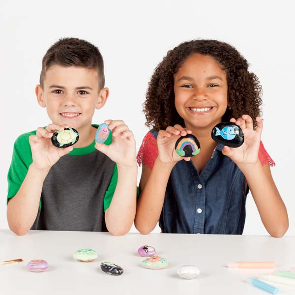 Faber-Castell Creativity for Kids Glow in the Dark Rock Painting Kit. This rock painting kit is a wonderful way for kids to engage in a fun activity that promotes exploration, community building and artistic expression. Designed for beginners, everything you need to make 10 painted rocks that glow in the dark is included. Share your rock painting ideas with rock painters and rock finders everywhere! Part of the excitement with this kit is sharing with others. Once painted designs are complete, place the clear tracking stickers on the bottom of your rocks. That way you and the finder can post pictures on our Facebook and tag. Pack includes - 10 natural river rocks (sizes vary), 5 colours of glow in the dark paint, 6 regular paint colours, tracking stickers, 2 paint brushes and instructions.