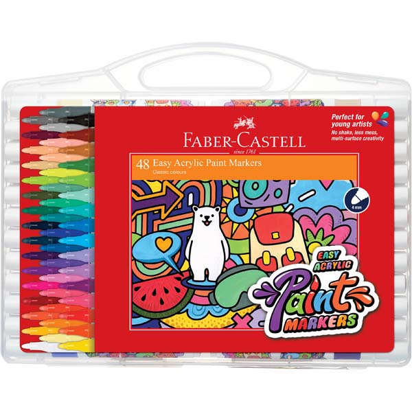 Create beyond the canvas with Faber-Castell Easy Acrylic Paint Markers. Crafted for creativity and convenience, these paint markers provide ready-to-use vibrant colours that pop on many surfaces, from paper, metal, wood to ceramic, glass or fabric. Safe and non-toxic, they are the ideal tools for budding artists.