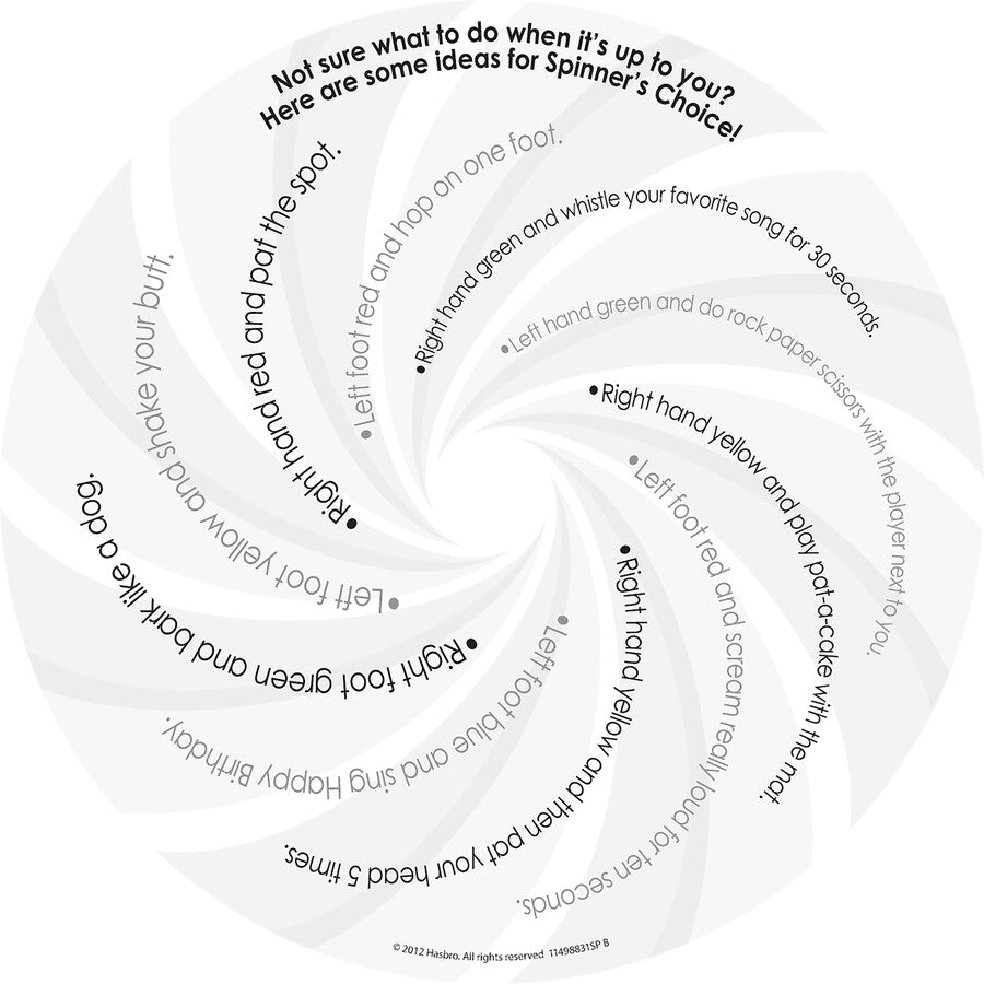 Add a twist of fun into any party or family night with the game that ties you up in knots! This TWISTER game is the classic game with 2 more moves. Give the spinner a whirl and see what's next as you try to keep your hands and feet on the mat! Right foot red! Can you do it? Left foot green... you got it! If your knee or elbow touches the mat, or you fall over, you're out. Be the last player standing to win!TWISTER game challenges you to put your hands and feet at different places on the mat without falling over! Be the last player standing to win. Two new moves! With Spinner's Choice, the spinner makes up a move for the other player to do. Fun Spinner's Choice ideas on the back of the spinner! If the spinner lands on Air, the player must put a hand or foot in the air!
