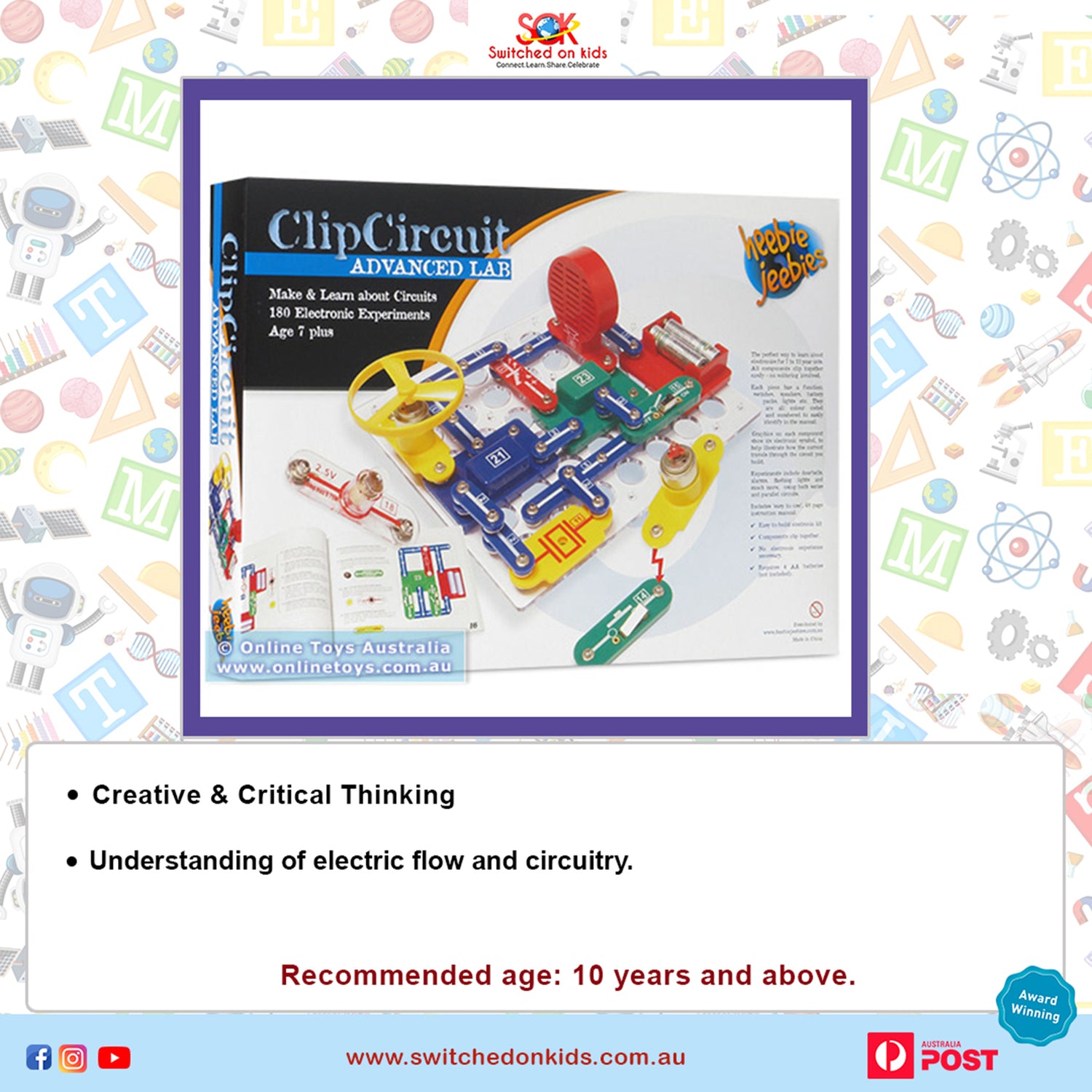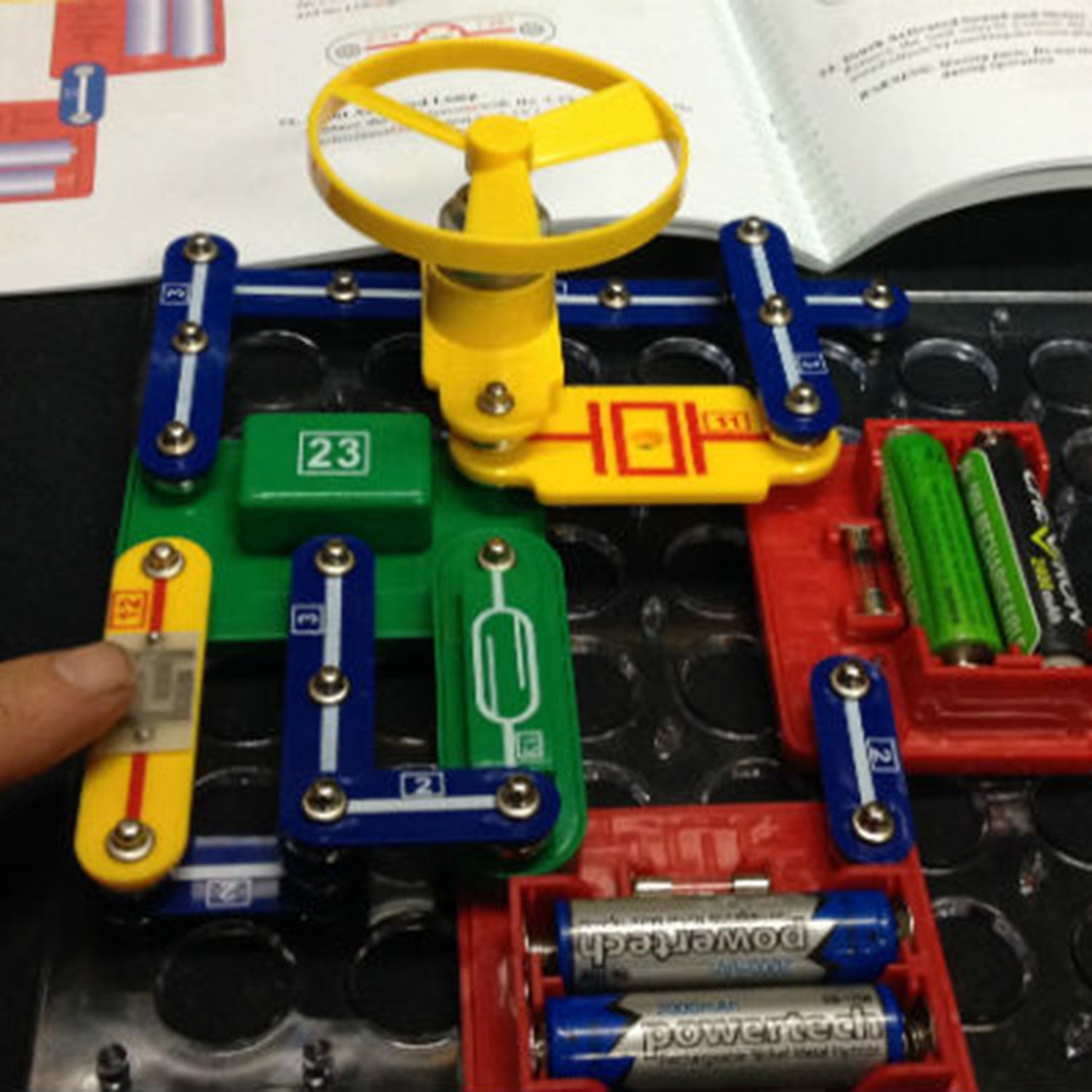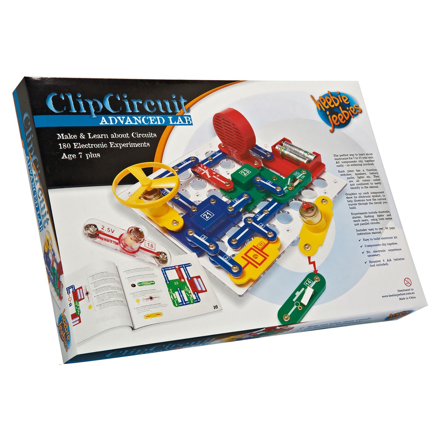 The perfect way to learn about electronics for 7 to 12 year olds. All components clip together easily, no soldering required. The graphics on each component show its electronic symbol to help illustrate how the current travels through the circuit you build.Each piece has a function, switches, speakers, battery packs, light etc. They are all colour coded and numbered to easily identify in the manual.Experiments include doorbells, alarms, flashing lights and much more, using both series and parallel circuits. The advanced lab puts the fun of science at your fingertips.