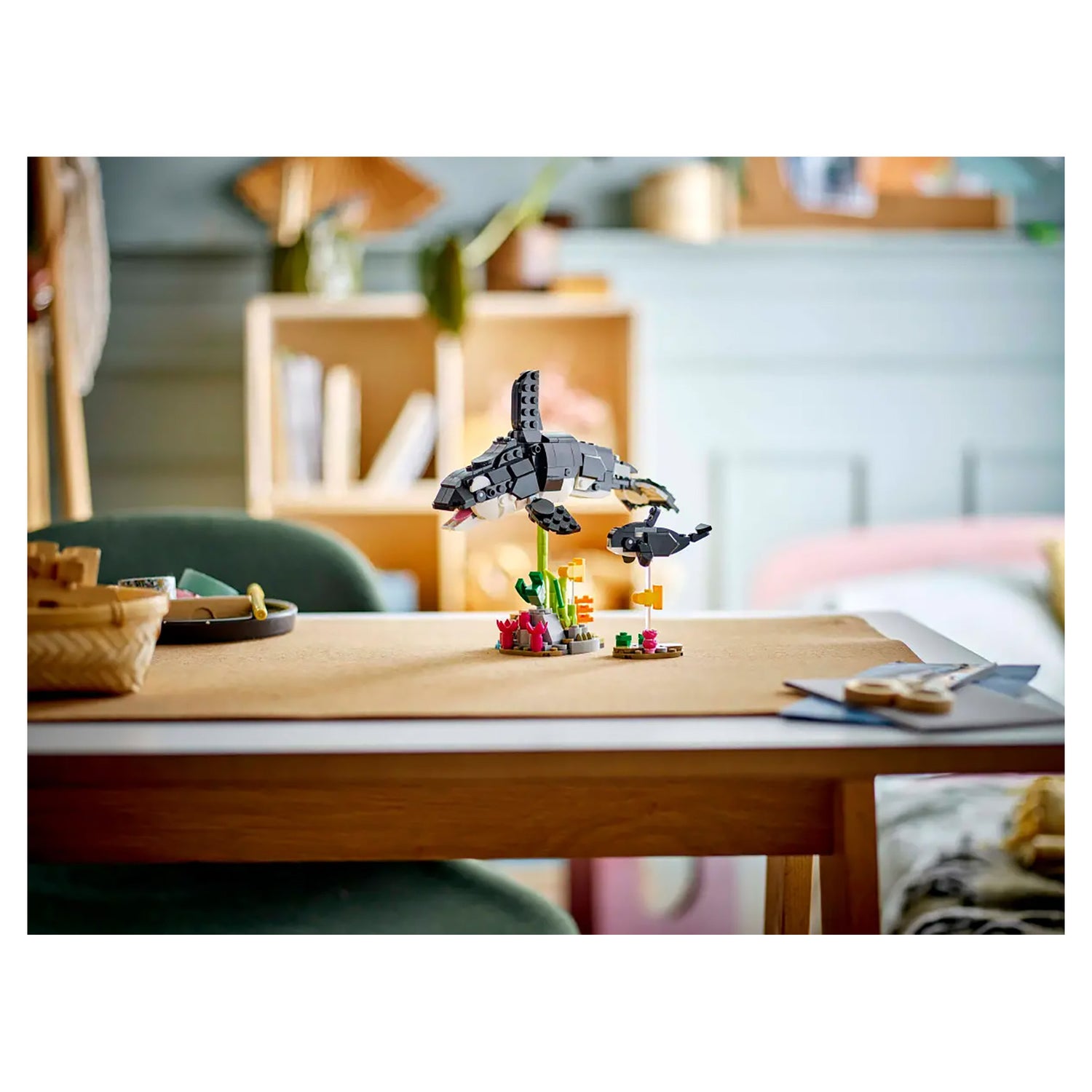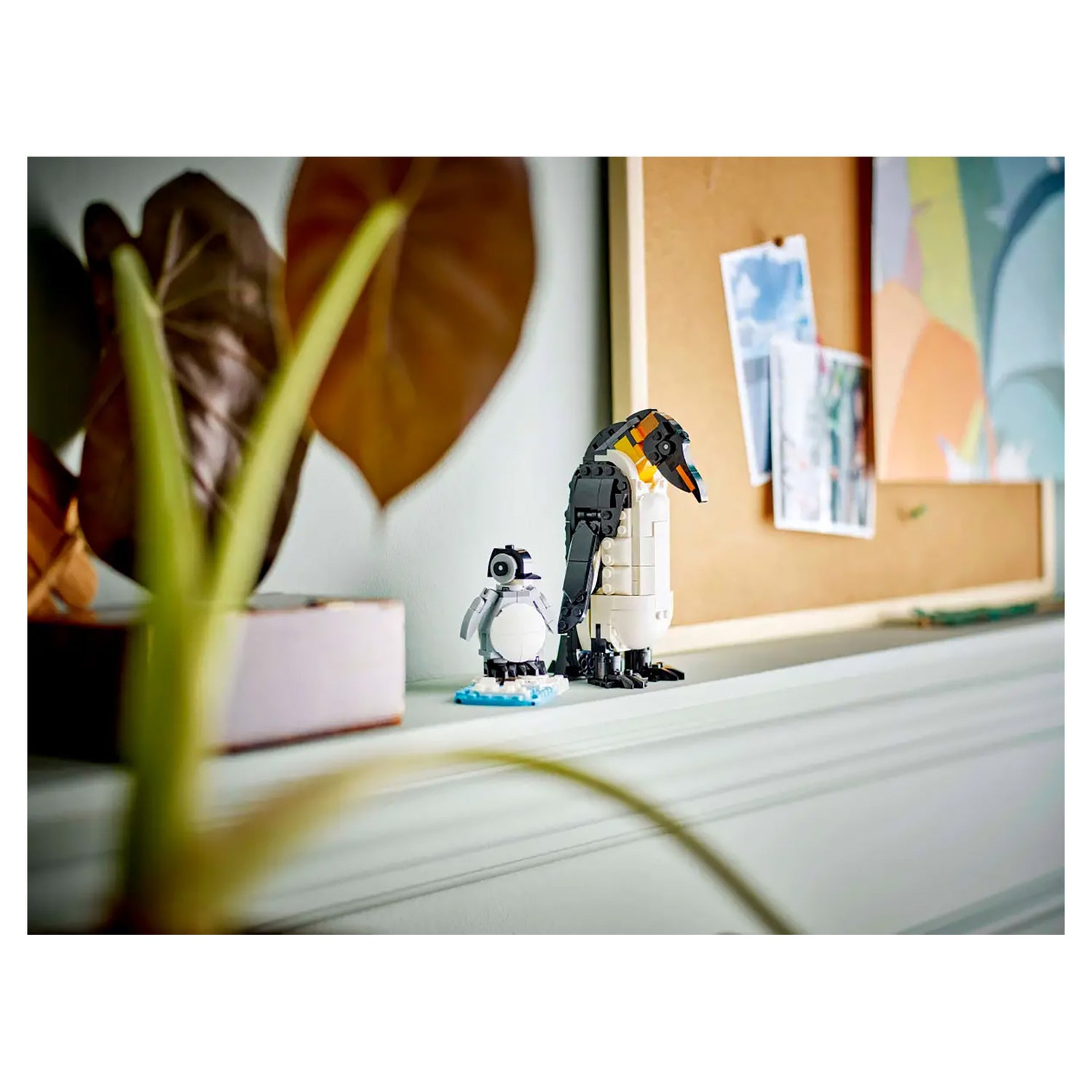 Kids can choose to build 3 different LEGO® animal playsets with the same set of bricks: a posable panda figure with its cub next to bamboo stalks; a posable orca figure with its calf, who can be displayed together on transparent stands; or a posable penguin toy and its chick on a patch of ice and water. All 3 scenes make a great LEGO gift for kids for imaginative play and display.