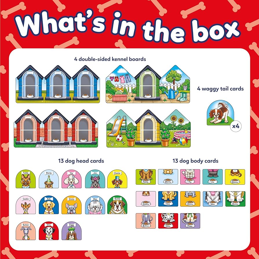 Doggy Doggy Woof Woof! is a lively doggy-themed matching and memory game with double-sided boards and two fun ways to play. In game 1, players try to complete three dogs on their kennel board by matching dog heads to bodies, shouting "Doggy Doggy Woof Woof" after each successful match. Keep your eyes peeled for the waggy tail card - when you find it, it's time to stand up, wag your tail, and shout "Waggy Waggy Woof Woof" and play passes to the next player! For game 2, turn over the kennel board and try to collect as many complete, matching dogs as possible by taking it in turns to pick a card from the pile of dog heads and bodies and try to match with any of your face up cards on the table! With 13 different adorable pups to complete, this game will have children barking with excitement! This game is sure to bring smiles and laughter to all players, young and old. Perfect for family game night or a fun activity with friends. Get ready to unleash your inner pup and have a tail-wagging good time!