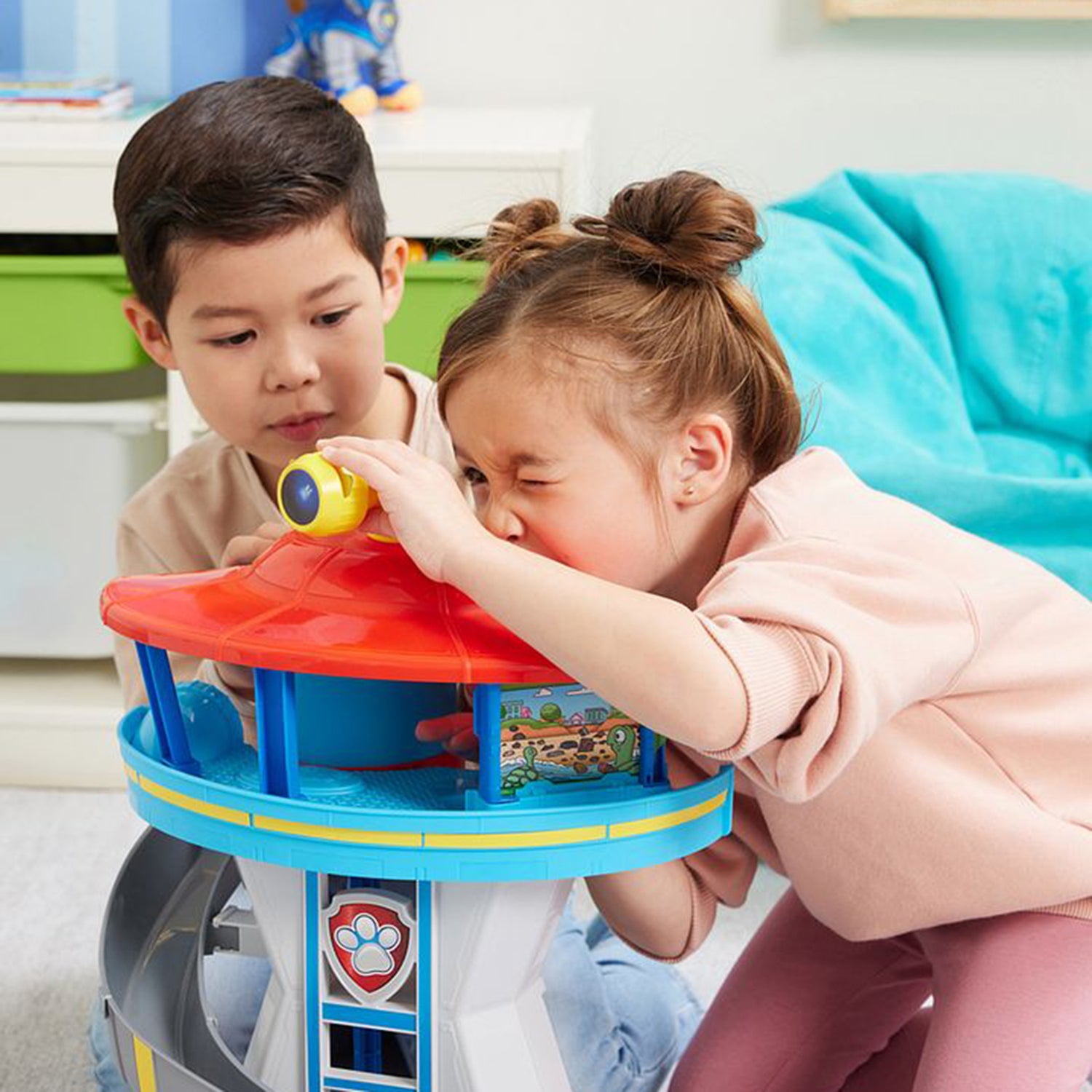 Chase is ready for action, in the PAW Patrol Lookout Tower playset! This exclusive playset features the Lookout Tower that you know from the show, along with Chases police cruiser and two Chase action figures Off-Duty Chase and Hero-Pup Chase! At 20-inches tall, the lookout tower has the perfect vantage point to watch out for trouble! When its time for an exciting rescue, place off-duty Chase into the front of the tower elevator, and place hero-pup Chase into the back of the elevator.Raise the elevator to make it rotate and watch off-duty Chase get ready for action as he turns into hero-pup Chase! Once hes at the top of the Lookout Tower, stop by the mission control panel to select your mission details for the day by choosing one of 3 double-sided mission cards! After selecting your mission card pick from one of 3 double-sided periscope cards, to view through the tower periscope, so you know where to go! When its time for a super-charged rescue, slide Chase down the tower slide to hop directly into Chases police cruiser, before slamming down on the vehicle launcher to burst into action!