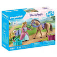 With great devotion, the elegant princess takes care of her magnificent horse. The princess is equipped with a removable skirt, allowing her to ride comfortably on her faithful steed. After an extensive ride, the horse can be rewarded with a juicy carrot and a cozy blanket once the saddle is removed. For a particularly festive occasion, the horse's harness can be adorned with shimmering ribbons and stars.