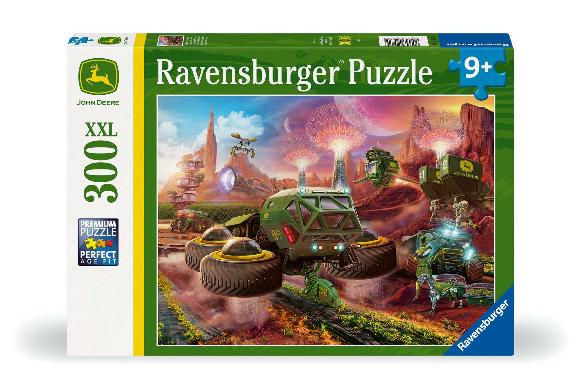 Grow a bumper crop of fun while farming on a far-away planet with our "Future John Deere" 300-piece puzzle! Cultivate the fertile landscape of your imagination as you piece together this "Future John Deere" puzzle! On a distant planet in the not-so-distant future, a prospering outpost uses the Deere All Terrain Automaton (DATA) to till the land. A farmer observes progress while receiving information on a wrist console as an Aerial Carrier Engine (ACE) conveys vegetation from the space port. Robo Rex approves of the John Deere technology that makes life here possible and this puzzle so much fun!