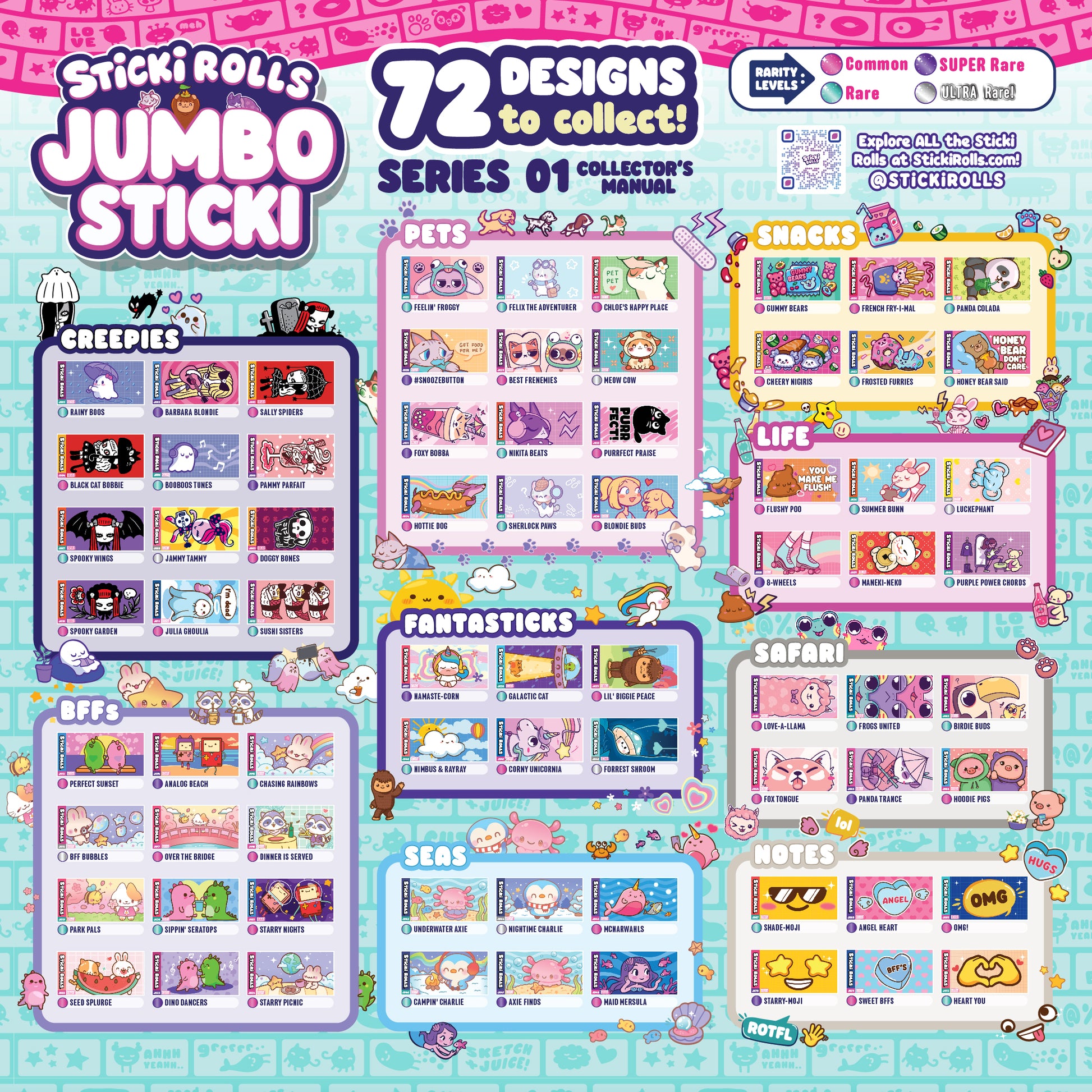 GIANT FOIL FUN – Each Jumbo Stickies capsule includes 1 Jumbo Sticki Rolls Sticker. 72 jumbo-sized stickers to potentially collect featuring dazzling foil holographic effects—perfect for walls, mirrors, lockers & more!