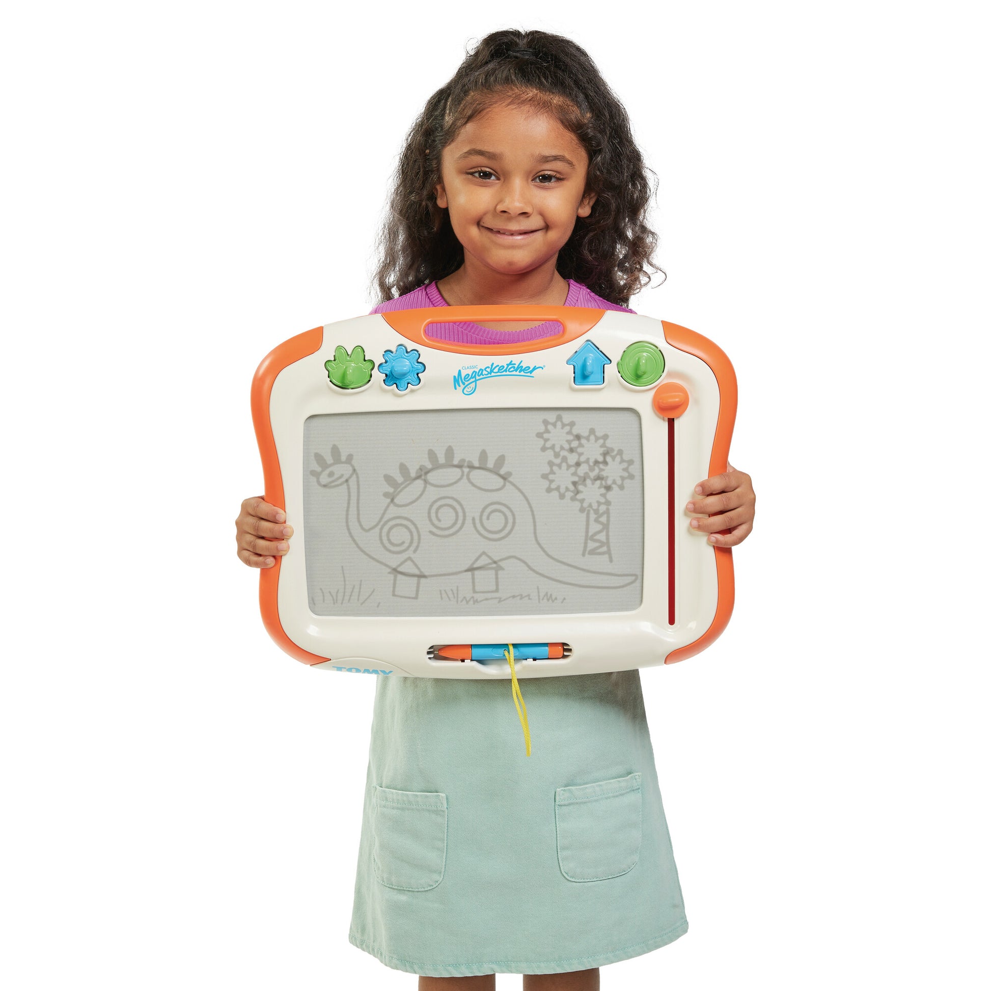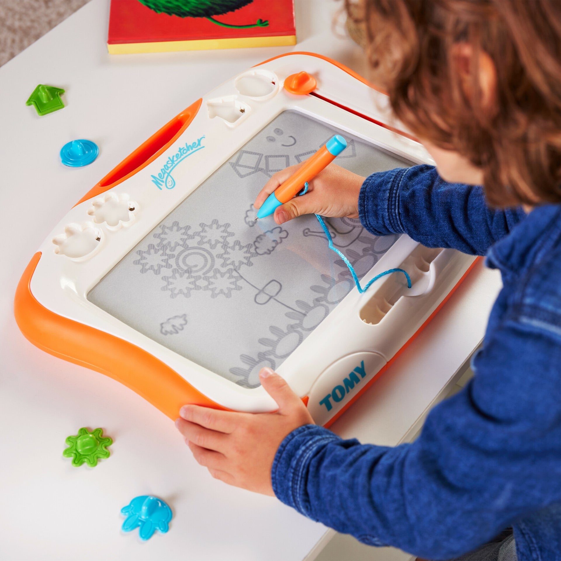 Children love to draw, and the Mega sketcher from Tomy is a fun, clean, and tidy variation on the traditional pencils and paper. The Mega sketcher measures roughly 45 x 30 cm (18 x 12 inches), with the magnetised 'screen' taking up most of the surface area. A magic 'pen' (attached by a piece of string to avoid losing it under the sofa) allows children to draw, scribble, and write, while the four magnetised stamps add a different dimension to youngsters' designs. Once a composition is complete, or if one too many mistakes have been made, simply pull the eraser lever up and down and it wipes away the redundant drawings. This kind of drawing aid has become a firm favourite, thanks mainly to its ability to be used over and over again no matter how many mistakes are made. The Mega sketcher is a fun, practical way of developing artistic awareness, creativity, and fine and gross motor skills in children, and is perfect for long car journeys or rainy afternoons. Suitable for children aged 3 years and over.